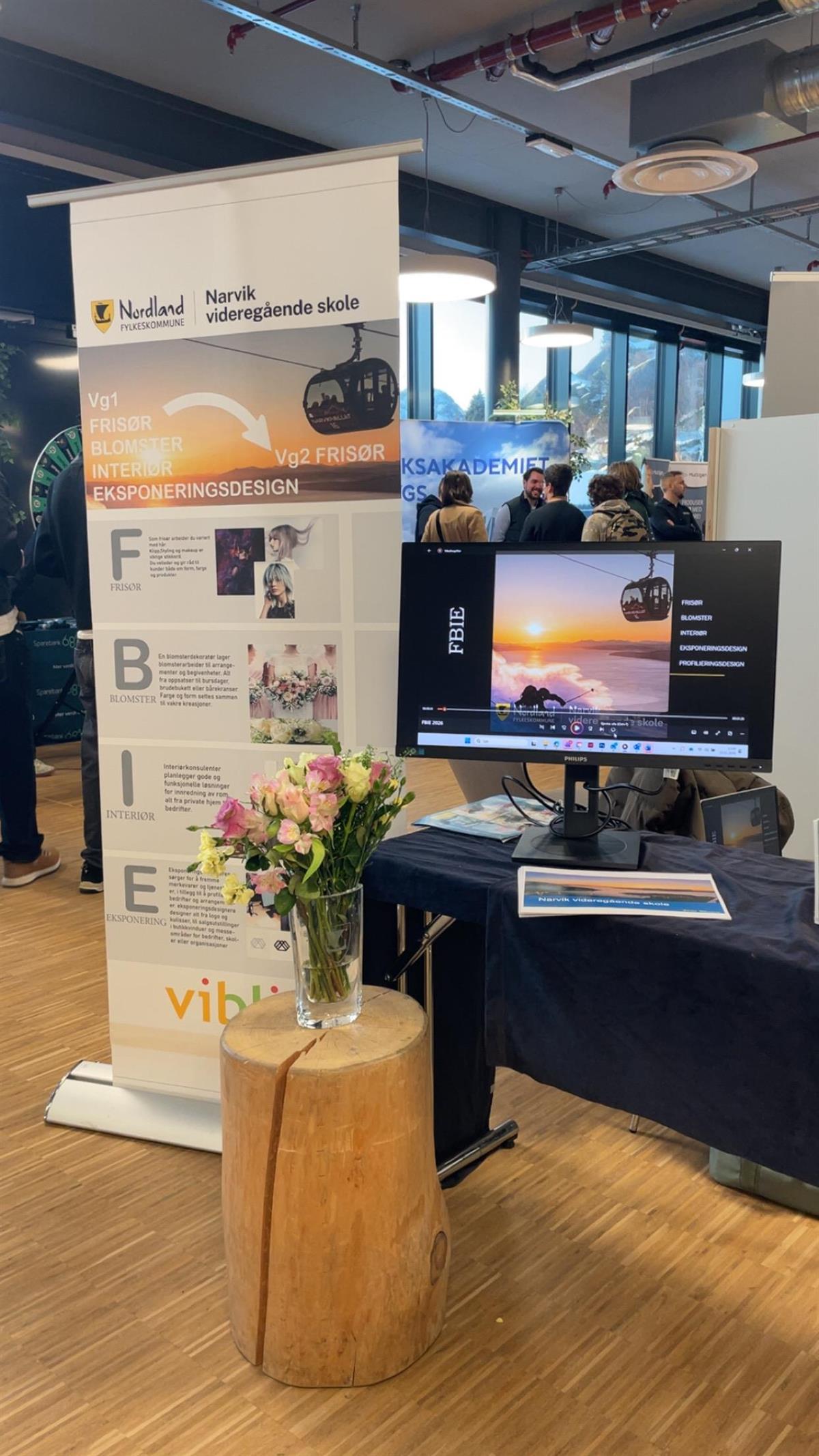På standen til Narvik vgs kunne ungdommen få møte rådgiver Margit Hauge Livelten og lærer på VG1 frisør, blomster, interiør- og eksponeringsdesign Marita Ivarsson Elverum. Det ble en meget vellykket tur og mange håpefulle og interesserte elever kom innom standen for å få høre om hvordan utdanningen er og hvilke fremtidsmuligheter FBIE-linjen gir.